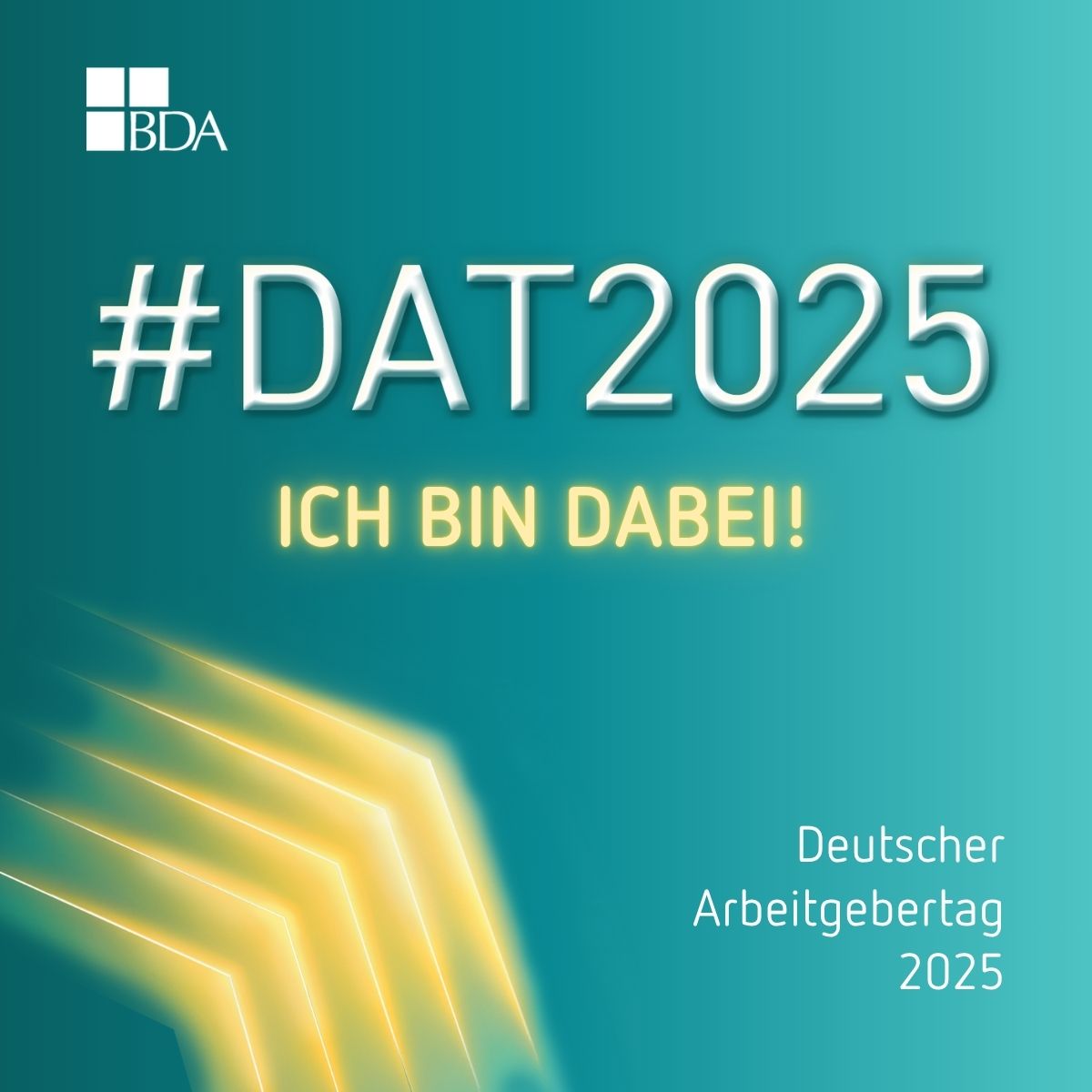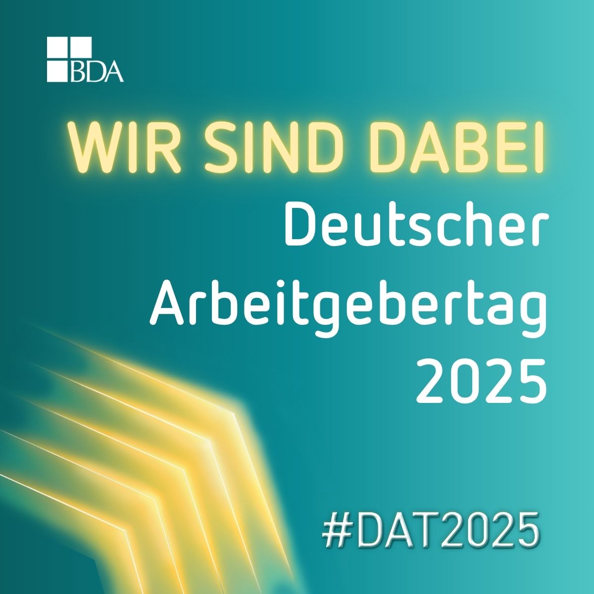 Für die Berichterstattung über den Deutschen Arbeitgebertag 2025 auf Ihren Social Media-Kanälen nutzen Sie gern unseren Veranstaltungs-Hashtag #DAT2025. Des Weiteren stellen wir Ihnen Social Media-Kacheln und GiF's zum Download bereit, die Sie gerne nutzen können.